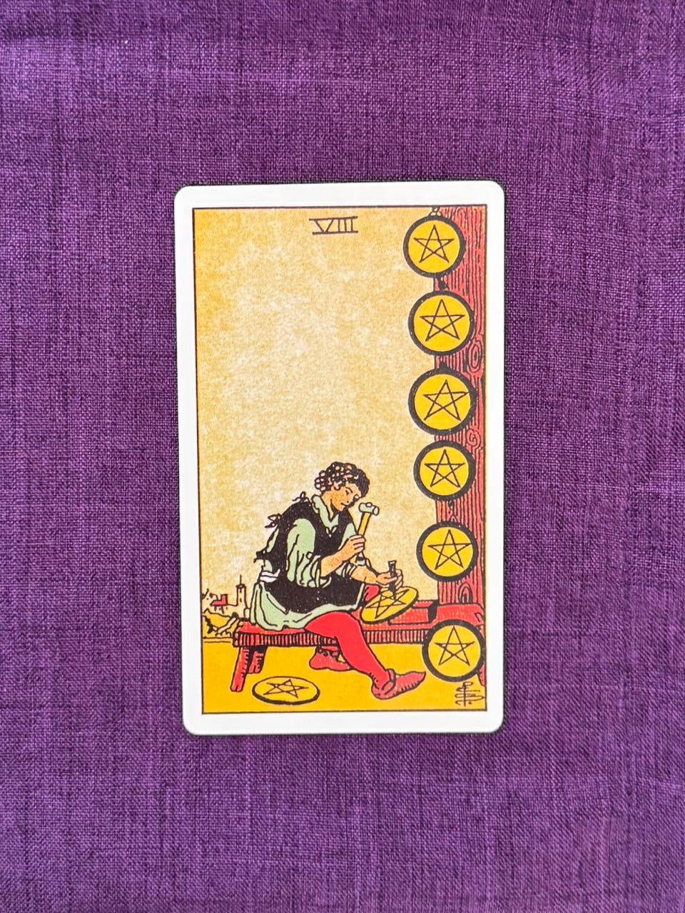 Today I pulled the Eight of Pentacles, and I had to laugh. Of course I did. It’s the card of devotion to the everyday — of showing up, doing the work, tending the details that no one else might notice.