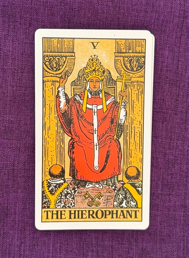 This card fell out of the deck as I was shuffling for this blog post. It’s so perfect because it’s all about tradition. The Hierophant is the keeper of structure, rituals, inherited wisdom, and the rules we are told to obey before we even ask if they fit. The shadow side is blind obedience. The liberating side is conscious choice. Instead of blindly following traditions, ask WHY? What is the meaning for you? Where can you create new traditions that have meaning for you? Traditions are the scaffolding that hold us. Maybe it’s time to see if that scaffolding is truly necessary.