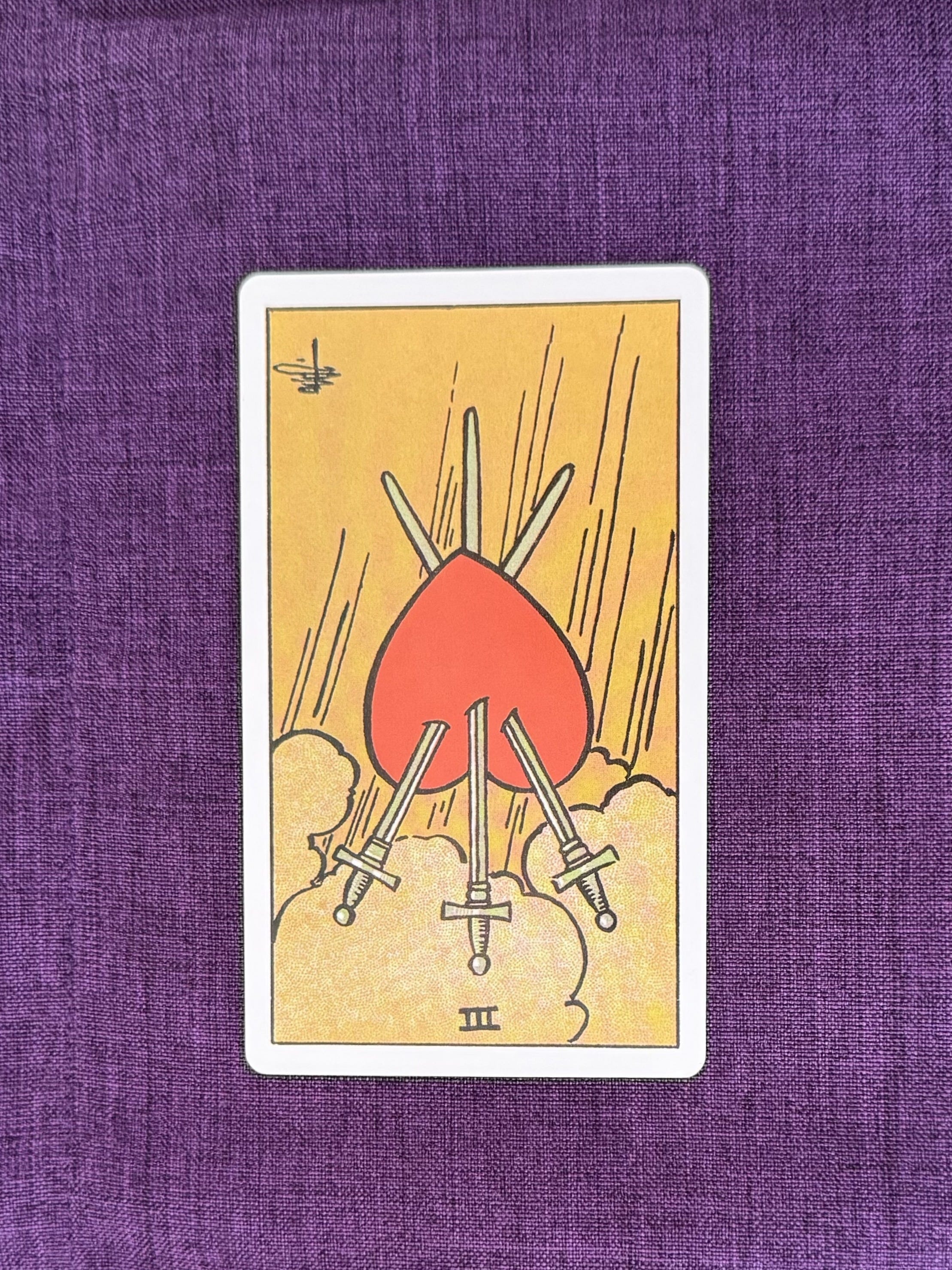 The next card I pulled was the 3 of Swords reversed. This signals a healing heart, often after betrayal, disappointment, or emotional wounds (crazy…). This card signified a process of emotional recovery from old pain. (Well, I got that going in spades…)